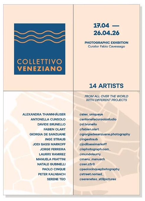 COLLETTIVO VENEZIANO 2026 COLLETTIVO VENEZIANO dal 17 al 26 Aprile 2026 Calle dei Bari – Santa Croce 971 – 30135 Venezia Vernissage 18 Aprile ore 18.00 Esposizione fotografica Entrata